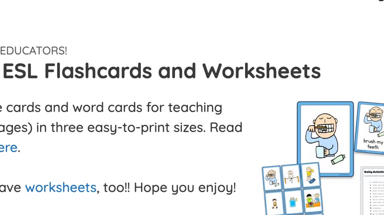 Offers free printable flashcards and worksheets for English language teaching and learning, with picture and vocabulary cards in various topics to support ESL students’ vocabulary, grammar, and phonics practice. Materials are designed for use by teachers, tutors, and learners, especially beginner and young English learners.